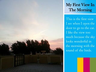 This document is a student's reflection on their journey through college. It consists of several photos and captions documenting the student's daily routine, from waking up in the morning to traveling to campus. The photos show the student's home, their route to college, classrooms, technology used, social activities, and family life. The student found this project valuable for recognizing how much different places and experiences have meant to them, and helping develop skills for their future career. They also realized the power of visuals to communicate ideas clearly.