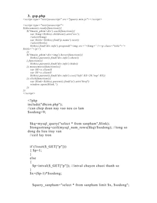 The document contains PHP code for a website that displays and searches product information from a database. It includes: