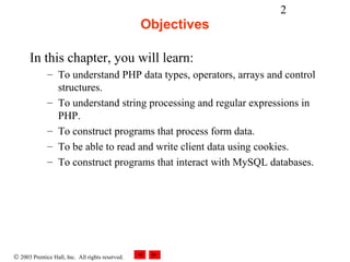 - The chapter will cover PHP data types, operators, arrays, control structures, string processing, regular expressions, form processing, cookies, and interacting with MySQL databases.