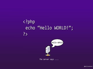 - The document discusses PHP implementations, basics of PHP syntax and control structures, and provides an example of a simple "Hello World" PHP program. It also notes some potential security issues to be aware of.