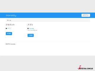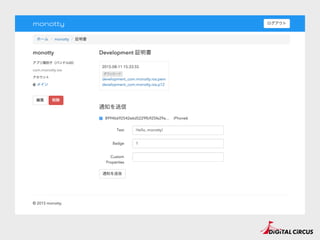 "Authorization: key=【APIキー】" --header Content-Type:"application/json"" https://android.googleapis.com/gcm/send -d "{"registration_ids":["【RegistrationID】"],"data": {"message":"Hello monotty!"}}" • かんたん。 • 生PHPでもぜんぜんOK。 😇