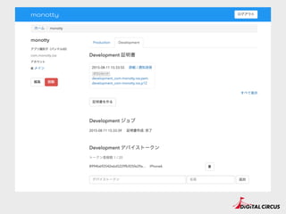 & 本番環境 • iOSの場合、2つの接続先がある。 • 開発ビルド: 開発用プッシュ通知サーバ(SANDBOX) • リリースビルド: 本番用プッシュ通知サーバ(PRODUCTION) • デバイストークンが異なる。 • 開発用のトークンを本番に投げるとエラーになる。 • 本番環境に開発用トークンが混ざらないように注意。 • とは言っても混じるので送信プログラム側でエラー処理をちゃ んとやる。
