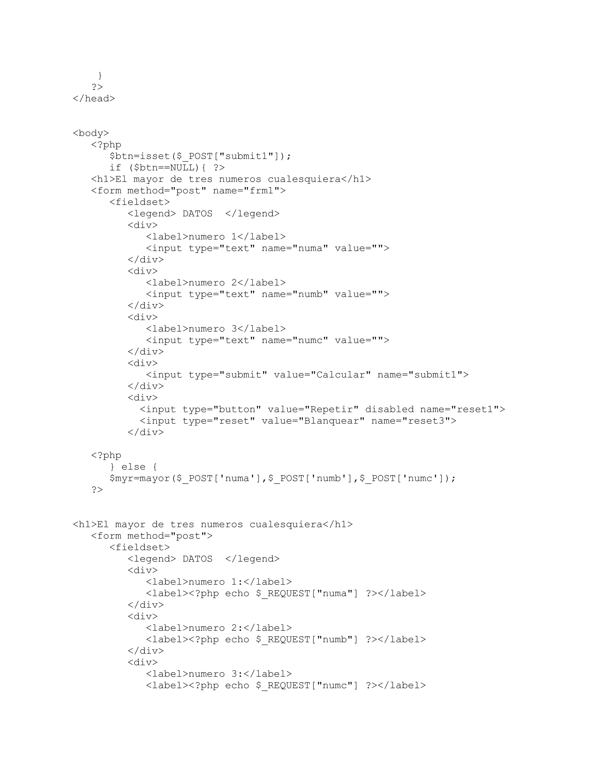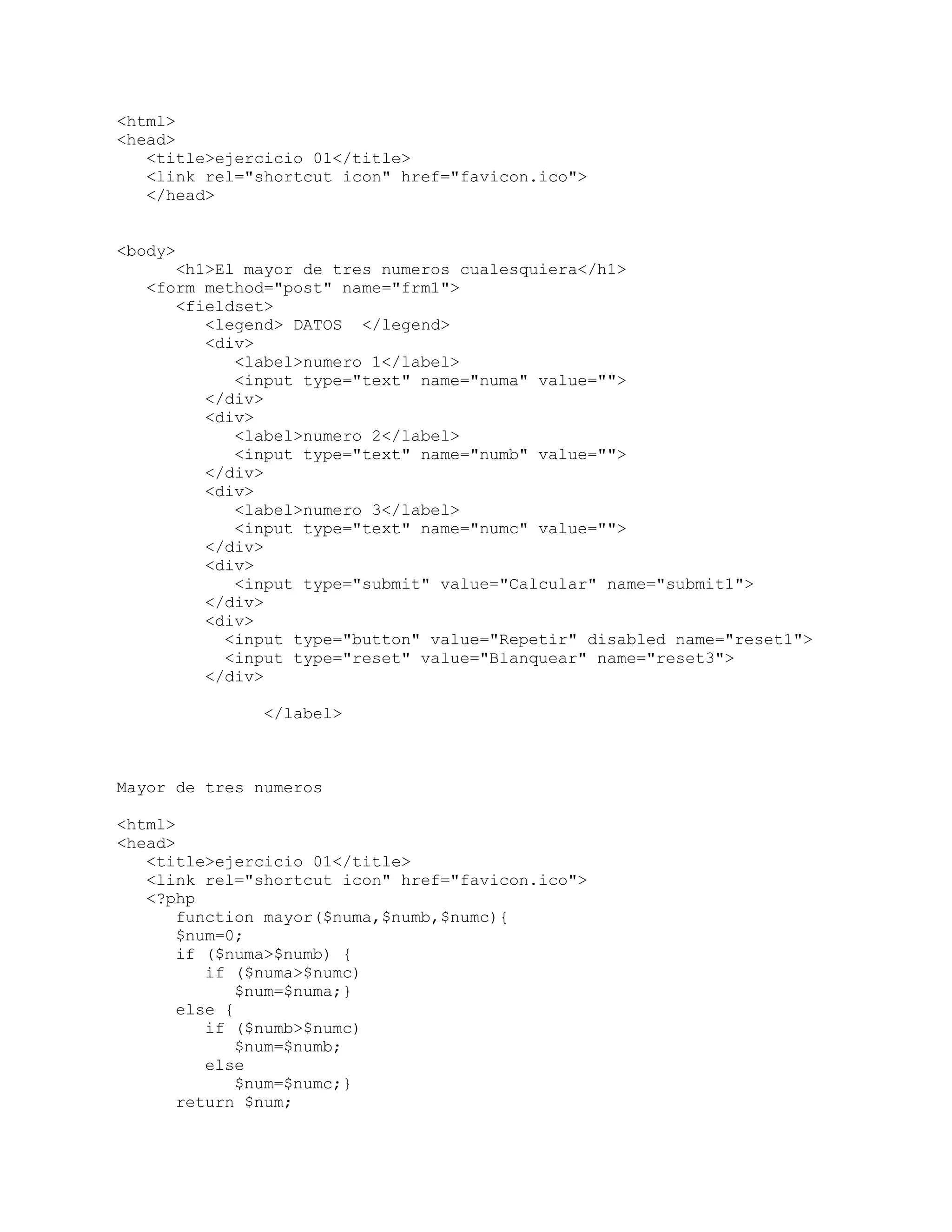 icon" href="favicon.ico"> </head> <body> <h1>El mayor de tres numeros cualesquiera</h1> <form method="post" name="frm1"> <fieldset> <legend> DATOS </legend> <div> <label>numero 1</label> <input type="text" name="numa" value=""> </div> <div> <label>numero 2</label> <input type="text" name="numb" value=""> </div> <div> <label>numero 3</label> <input type="text" name="numc" value=""> </div> <div> <input type="submit" value="Calcular" name="submit1"> </div> <div> <input type="button" value="Repetir" disabled name="reset1"> <input type="reset" value="Blanquear" name="reset3"> </div> </label> Mayor de tres numeros <html> <head> <title>ejercicio 01</title> <link rel="shortcut icon" href="favicon.ico"> <?php function mayor($numa,$numb,$numc){ $num=0; if ($numa>$numb) { if ($numa>$numc) $num=$numa;} else { if ($numb>$numc) $num=$numb; else $num=$numc;} return $num;