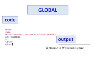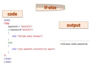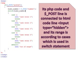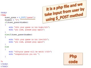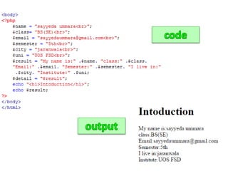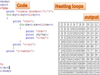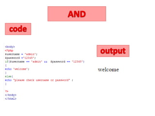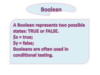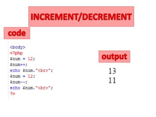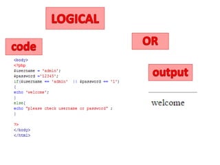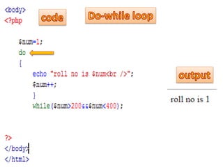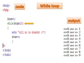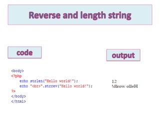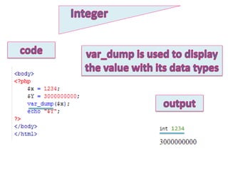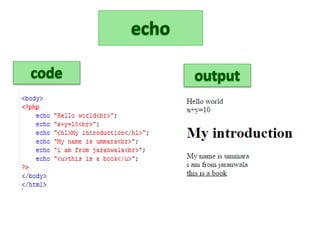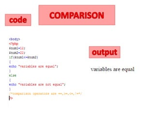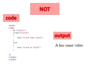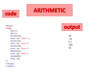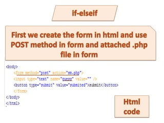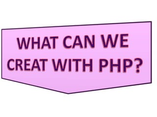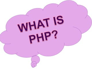 PHP is an open-source server-side scripting language used for building dynamic websites and web applications. It was created by Rasmus Lerdorf in 1995 and allows developers to embed PHP code into HTML documents. PHP code is executed on the server side to create dynamic webpage content which is then sent to the user's browser. Some common uses of PHP include social networking sites, e-commerce sites, news sites, and desktop applications.