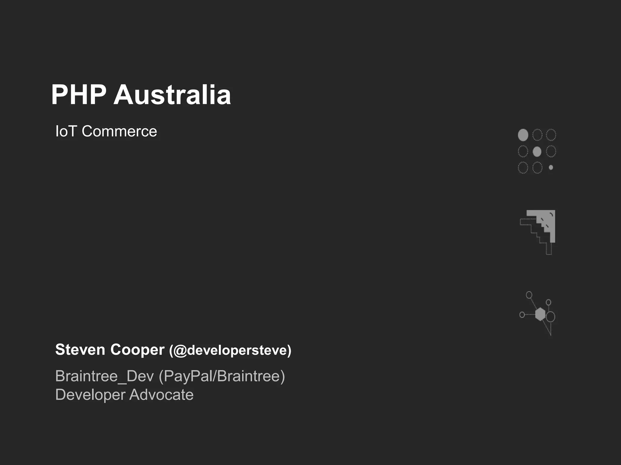 The document outlines Steven Cooper's insights on the simplicity and power of payment solutions available through Braintree, which supports various payment methods. It also touches on the integration of Internet of Things (IoT) with commerce, mentioning innovative applications like touchless order systems and remote-controlled devices. Additionally, it includes technical details about using Braintree's API with platforms like Magento and WordPress.