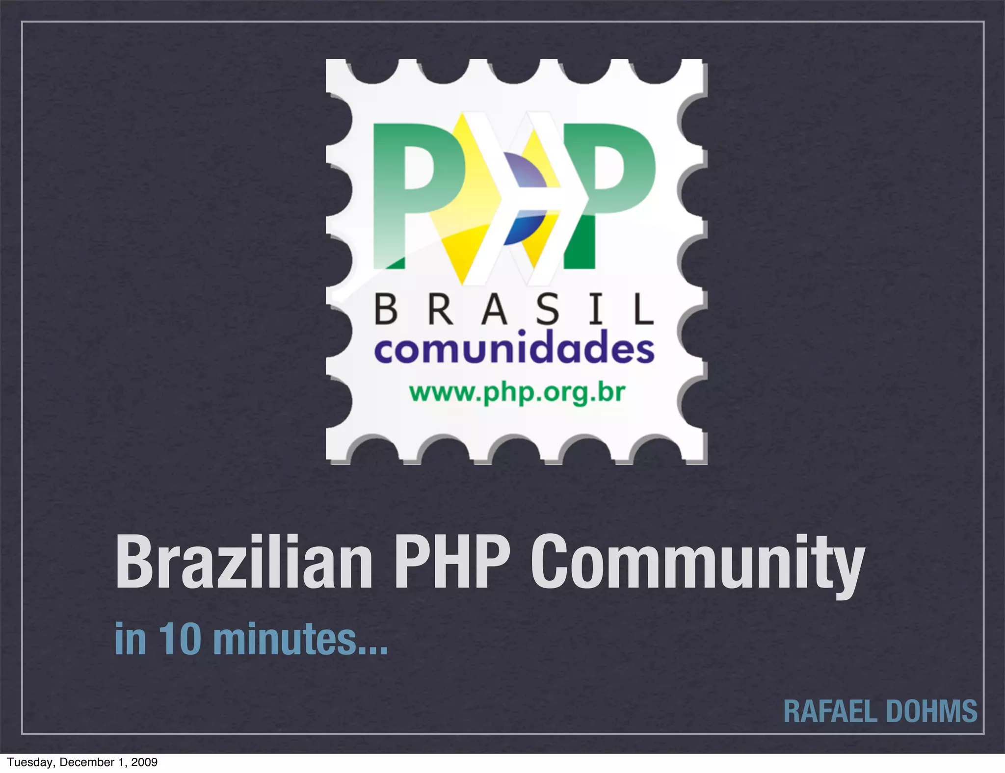 The document discusses the Brazilian PHP community and mentions that certain places in Brazil have PHP user groups. It notes the date of December 1, 2009 in multiple locations.