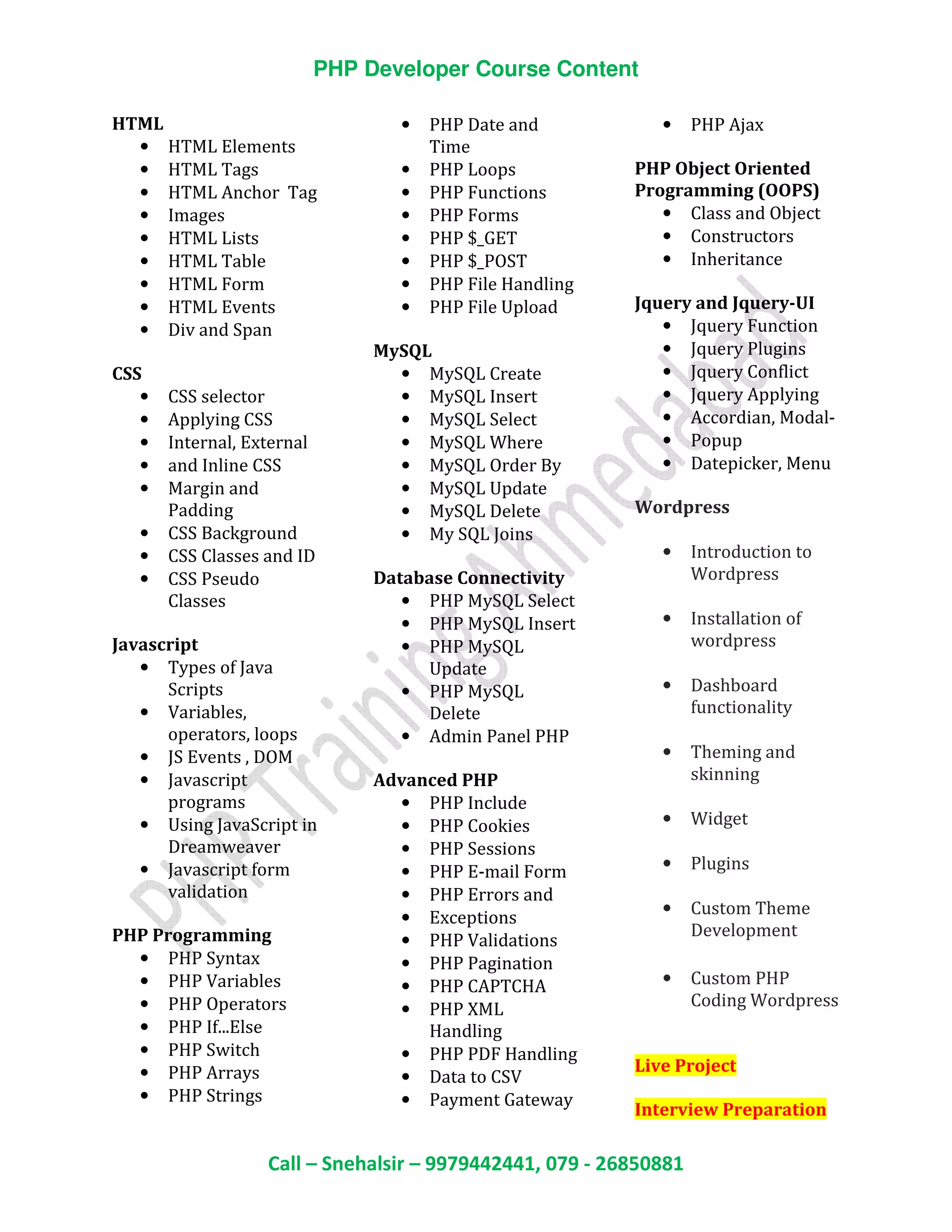 The PHP Developer Course Content document outlines the topics that will be covered in a PHP developer course, including HTML, CSS, JavaScript, PHP Programming, MySQL, Database Connectivity, Advanced PHP, PHP Object Oriented Programming, JQuery, WordPress, and a live project. Key topics include HTML elements and tags, CSS selectors and properties, PHP syntax, variables, operators, MySQL commands, database connectivity in PHP, PHP includes, sessions, errors, validations, AJAX, OOP concepts, JQuery functions, WordPress installation, theming, and custom theme development. The course will conclude with interview preparation.