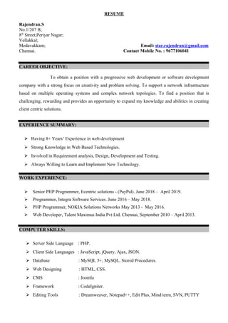 Rajendran.S is a senior PHP programmer with over 8 years of experience in web development. He has strong knowledge of technologies like PHP, JavaScript, jQuery, MySQL, and frameworks like CodeIgniter. He is seeking a challenging position that allows him to expand his skills in areas like software development, web design, and network infrastructure support. His resume lists relevant work experience, education qualifications, and details of projects completed.