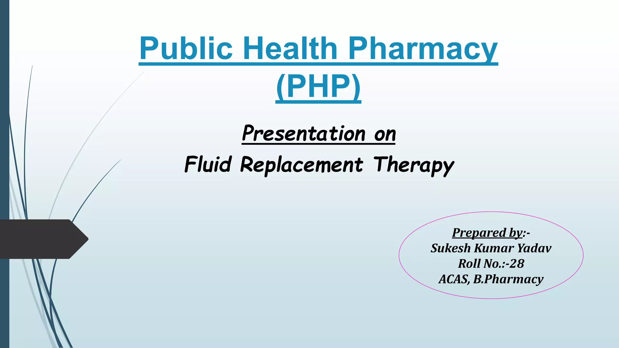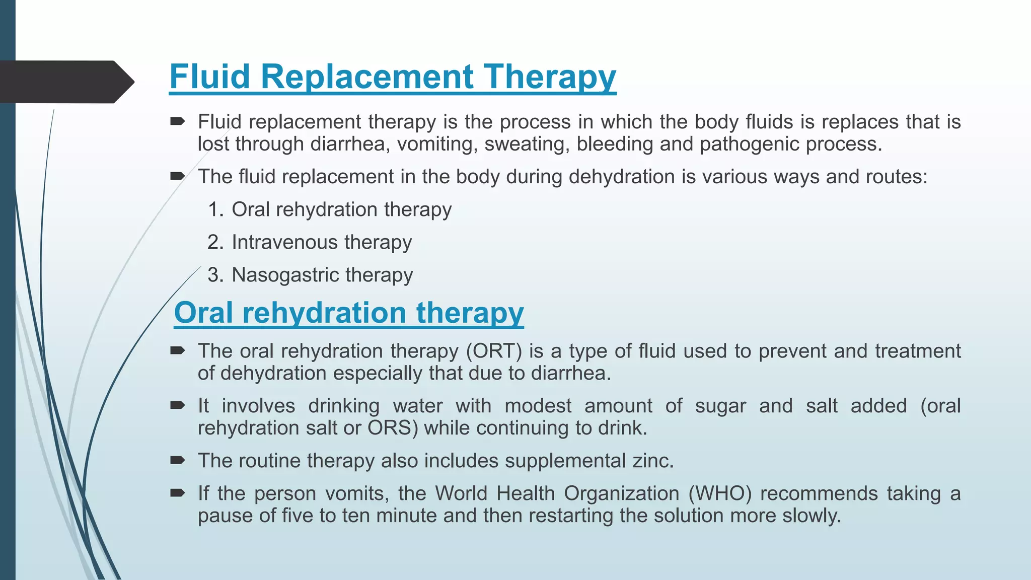This document discusses fluid replacement therapy and different methods used. It describes oral rehydration therapy which involves drinking water with modest amounts of sugar and salt to prevent and treat dehydration. Intravenous therapy provides fluid replacement directly into veins and is used to correct electrolyte imbalances or deliver medications. Nasogastric therapy administers food directly into the stomach through a tube for patients unable to eat orally.