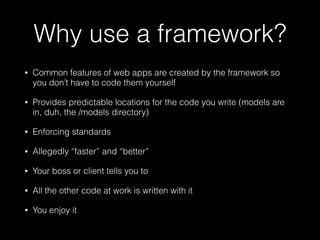 PHP frameworks provide common features like models, views, and controllers so developers don't have to build these from scratch. The document discusses several popular PHP frameworks like Laravel, Yii, Symfony, CakePHP, CodeIgniter, Phalcon, and Zend. It notes that while frameworks make similar claims about being fast, easy to use, and robust, personal preference and experience with a framework should be the primary factors in selection.