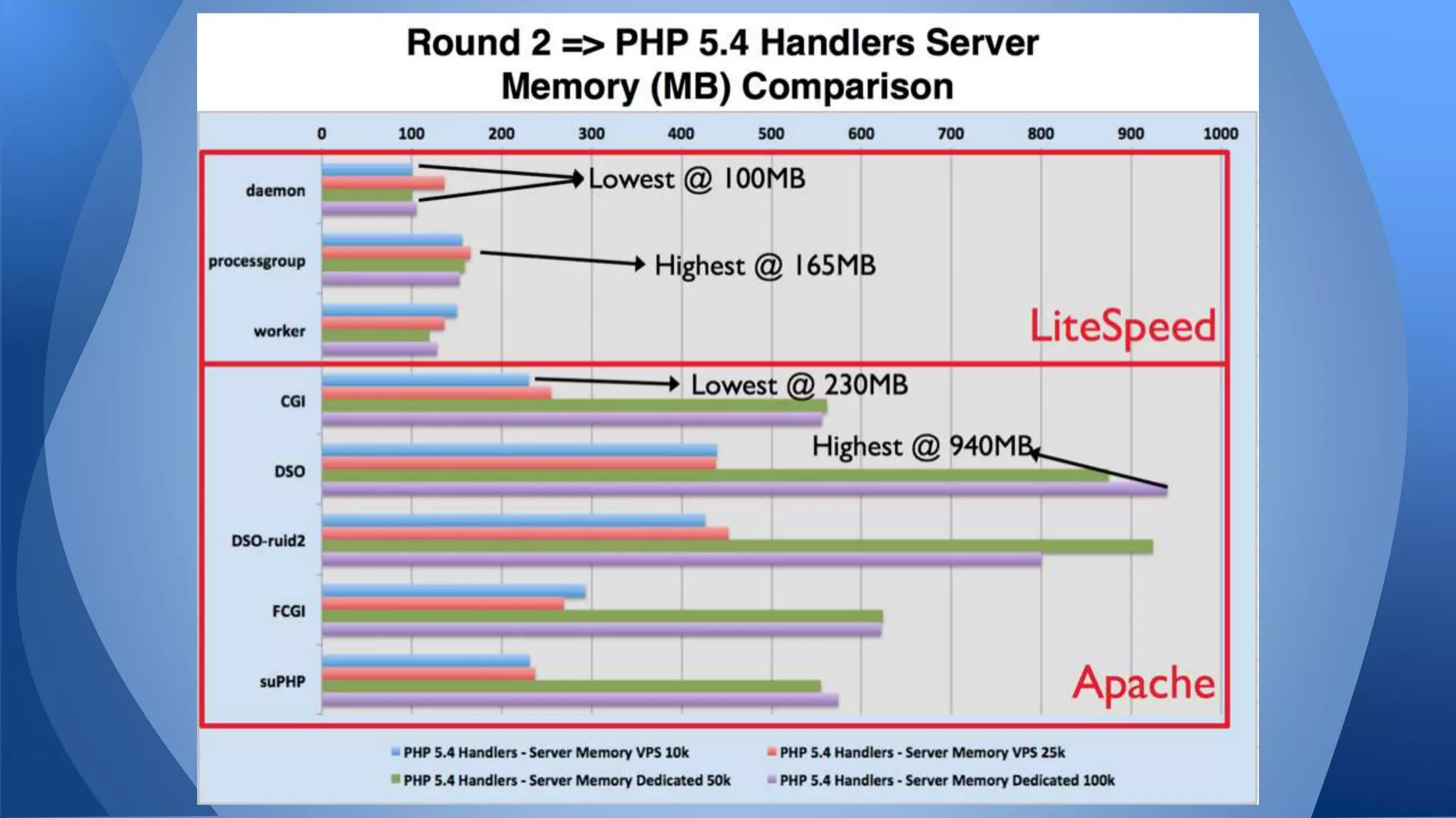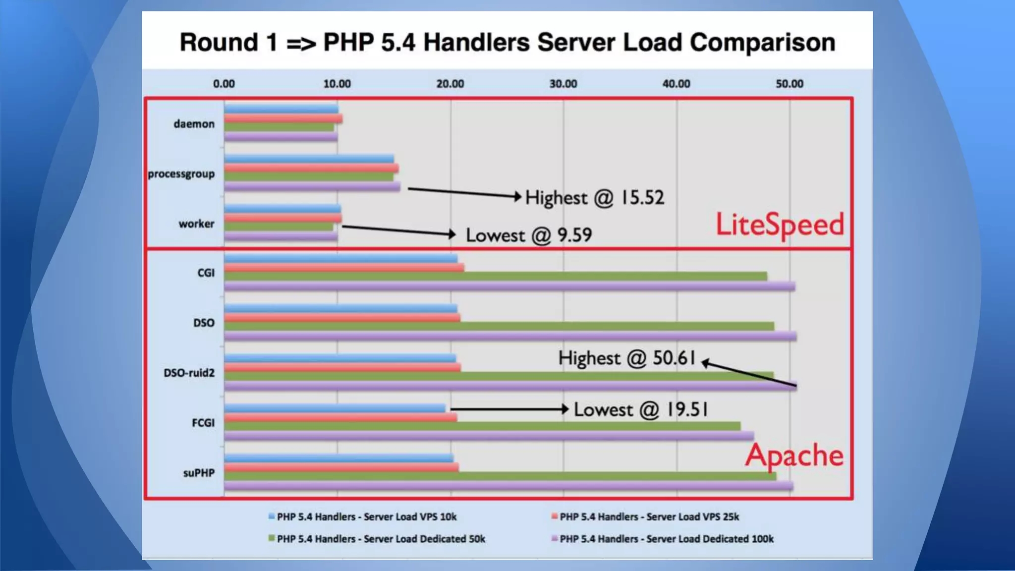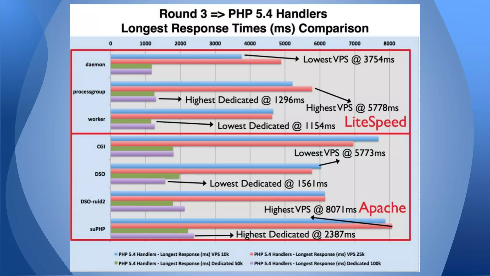 The document compares the performance of LiteSpeed Web Server (LSWS), Apache, and NGINX when processing PHP scripts. Three benchmarks show LSWS significantly outperforming the others, especially with keep-alive connections enabled. This is due to optimizations in the LiteSpeed Server API (LSAPI) and its tight integration with LSWS. LSAPI allows different PHP processing modes for varying performance needs and enables fast and secure suEXEC configurations with opcode caching.