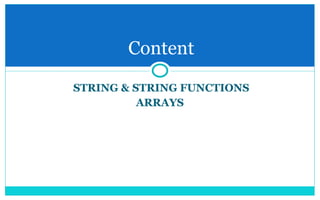 The document discusses various string and array functions in PHP. It explains that strings can be declared with single or double quotes, and how to escape characters within strings. It also covers concatenating strings, comparing strings, formatting strings with printf and sprintf, and capitalization/substring functions. For arrays, it explains how to create, access, loop through, and print arrays. It provides examples of indexed, associative, and multidimensional arrays. Finally, it lists some lab questions to test the string and array skills covered.
