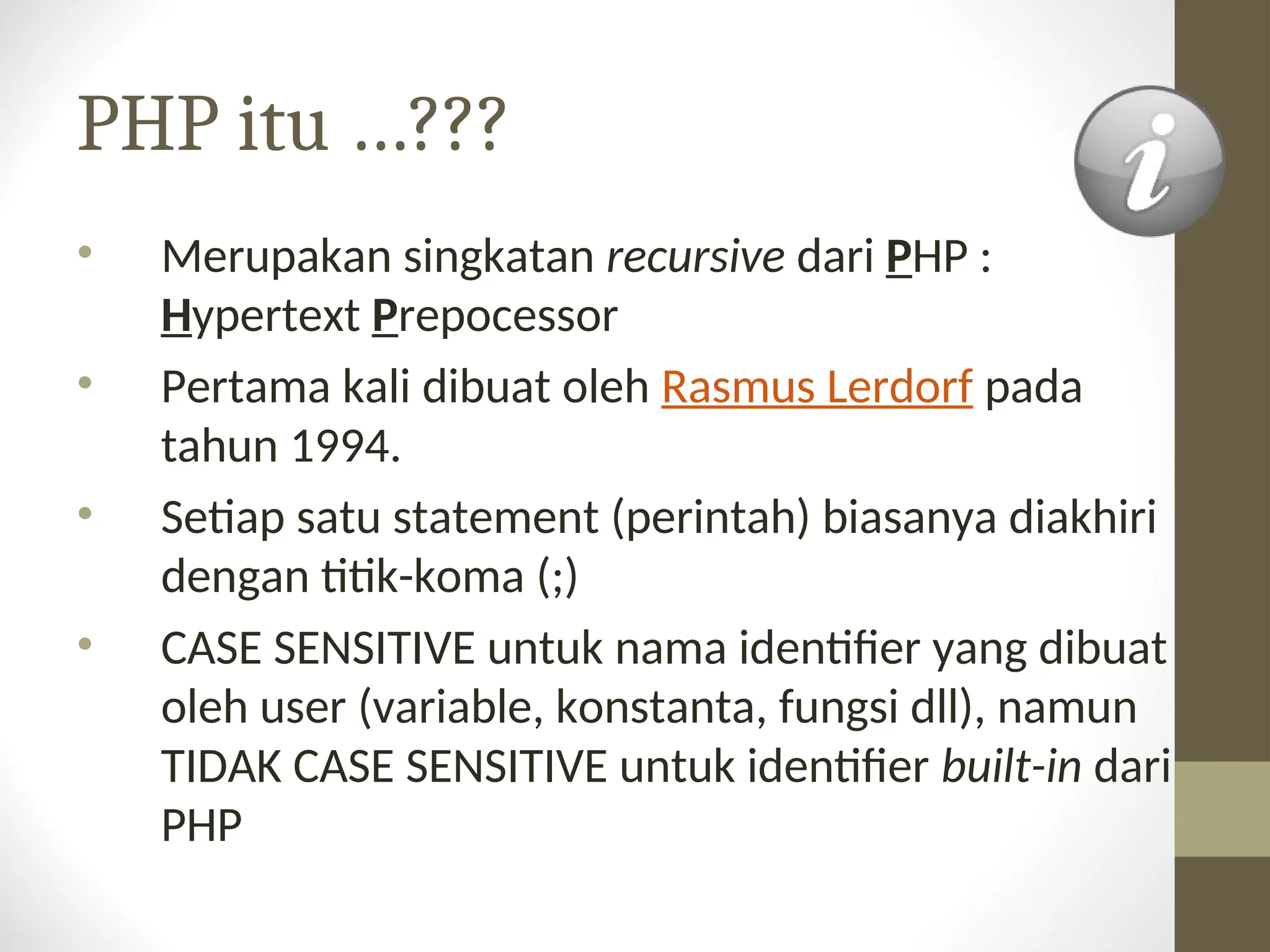 Dokumen ini memperkenalkan dasar pemrograman PHP, termasuk sejarah, penulisan script, dan variabel. PHP merupakan bahasa pemrograman yang sensitif terhadap huruf besar-kecil dan menggunakan berbagai tipe data seperti boolean, integer, dan string. Dokumen juga menjelaskan tentang konstanta, operator, dan memberikan contoh penggunaan PHP dalam integrasi dengan HTML.
