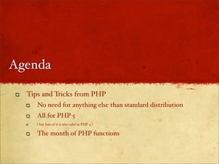 This document provides PHP tips and tricks summarized in 3 sentences: