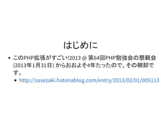 This document summarizes several PHP extensions categorized into areas like authentication, caching, databases, encryption and more. Each extension is briefly described with links to GitHub repositories or PECL pages showing the maintainer, latest release and initial release. The extensions range from 2013 to 2016 and provide features such as Kerberos authentication, local caching, Redis access, encryption algorithms and more.