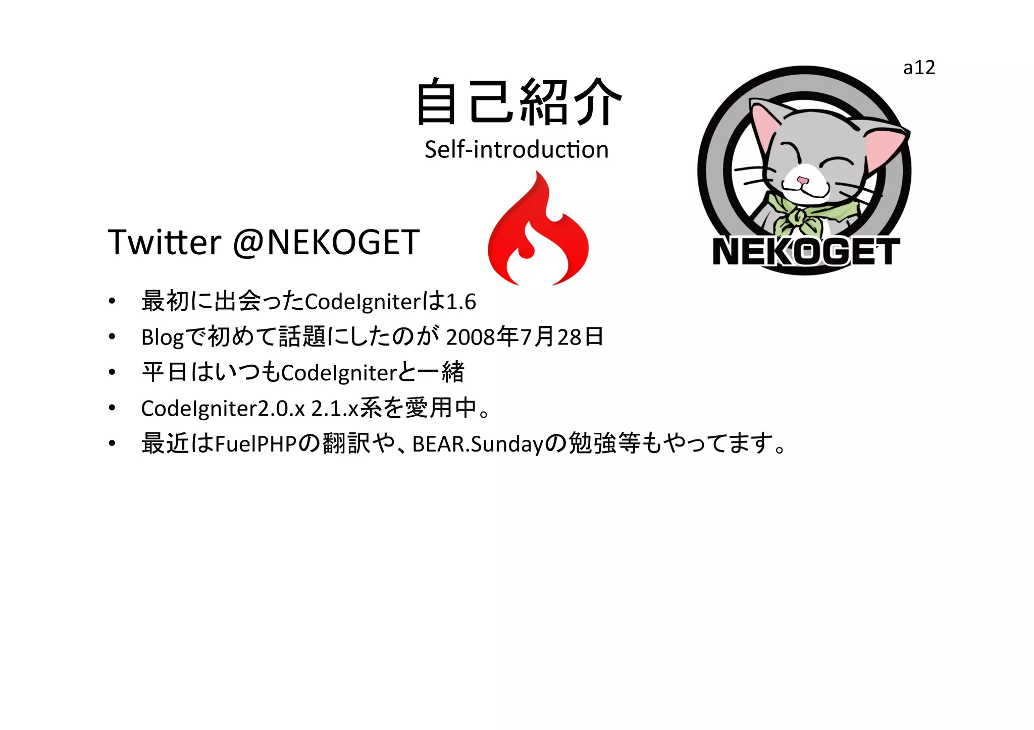 • 最初に出会ったCodeIgniterは1.6 • Blogで初めて話題にしたのが 2008年7月28日 • 平日はいつもCodeIgniterと一緒 • CodeIgniter2.0.x 2.1.x系を愛用中。 • 最近はFuelPHPの翻訳や、BEAR.Sundayの勉強等もやってます。 a12