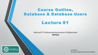 This document provides an outline for a course on databases and database users. It introduces key concepts about databases including what a database is, database properties, database management systems, actors involved with databases like administrators and designers, advantages of databases over file systems, and common database applications. The outline covers topics that will be taught like introduction to PHP and MySQL, how to code applications with databases, and how to perform common tasks with databases.