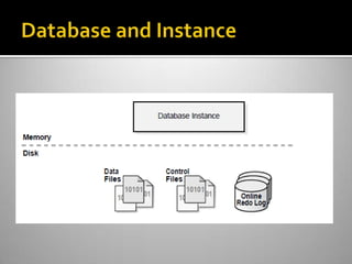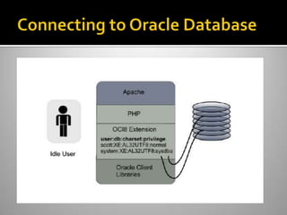 The document provides an overview of Oracle database technologies, detailing the history and evolution of Oracle Corporation, and describing various database editions, features, and programming tools. It outlines installation procedures for Oracle Database XE, configuration steps, and connection methods using PHP alongside code examples. Additionally, it covers important concepts such as database and memory structures, user schemas, and transaction processing within the Oracle ecosystem.