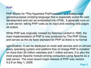 PHP is a widely-used scripting language for web development that is embedded into HTML. It runs on web servers and takes PHP code as input to create web pages as output. To use PHP for websites, you need PHP itself installed on a web server along with having a web browser. This document provides instructions on installing PHP and configuring it to work with an Apache web server on Linux. It describes downloading and extracting the PHP files, editing the configuration file php.ini, and restarting the web server for the changes to take effect.