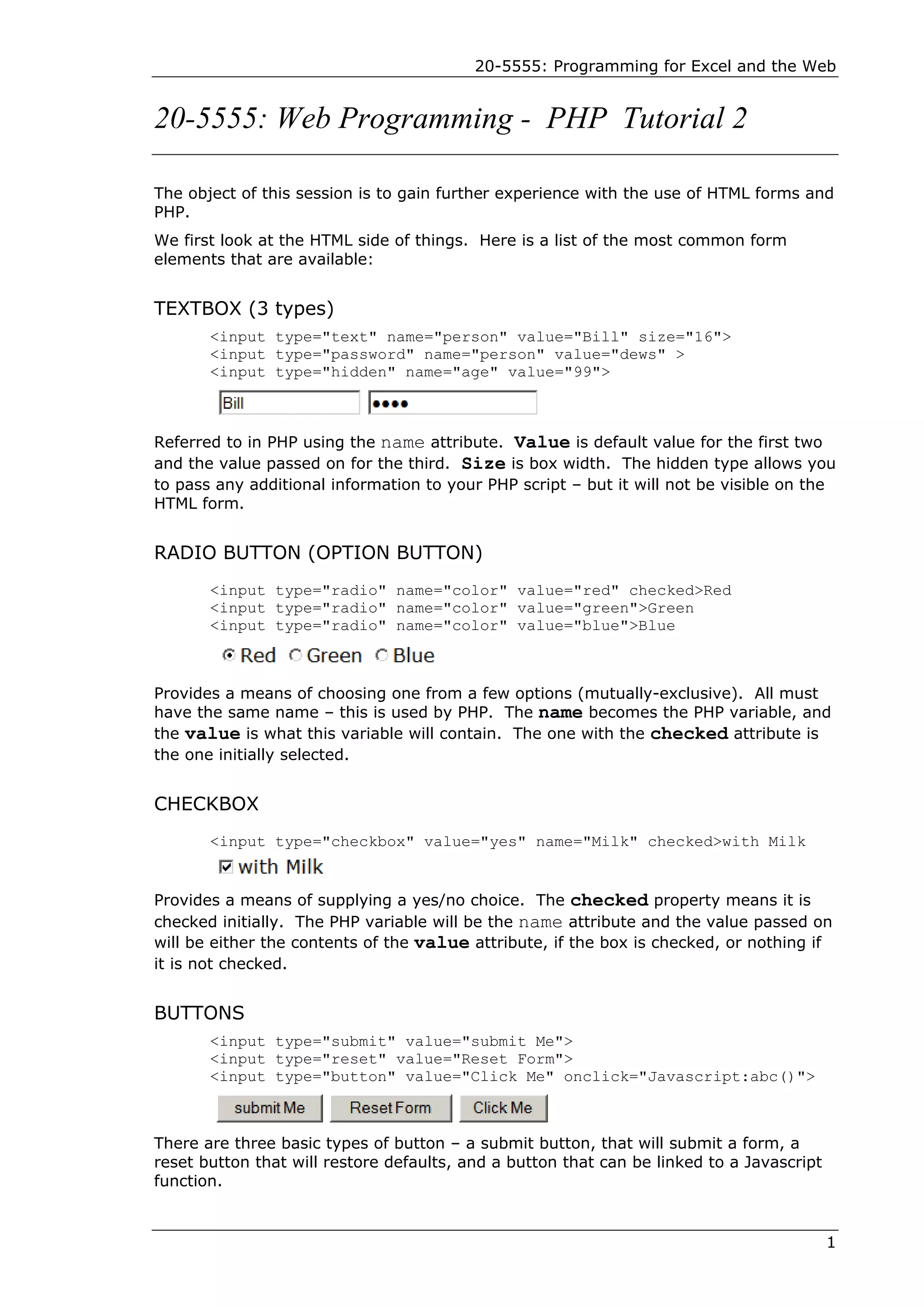 The document provides information on common HTML form elements like text boxes, radio buttons, checkboxes, dropdown lists, and text areas. It includes examples of the code needed to create each element. It also discusses using PHP to process form data submitted to a script and validates the form entries with JavaScript before submission. Validation ensures required fields are completed and data is in the expected format. The document provides an example HTML form incorporating the different elements and the corresponding PHP code to process the submitted values.