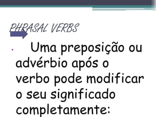 This document provides examples and definitions for several English phrasal verbs involving the verb "get". It explains that a preposition or adverb added after a verb can completely change its meaning. Some key phrasal verbs defined and exemplified include: put out, run away, take off, get back, get on with, get around, get at, get away, get back, get by, get in, get off, get on, and get over. The document notes that in some specific cases, the preposition or adverb can come after the object instead of the verb.