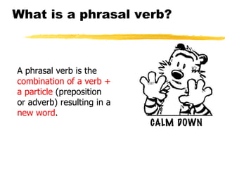 The document discusses phrasal verbs, which are combinations of verbs and particles (prepositions or adverbs) that create new meanings. A phrasal verb can have both a literal and idiomatic meaning. Some examples given are "put out" meaning to extinguish something literally but also fail or stop figuratively, and "take off" meaning to leave the ground literally but also begin or become popular non-literally. The document encourages looking up additional phrasal verbs like "set off", "wind down", and "take over" in the dictionary to find their different literal and idiomatic definitions and usages.