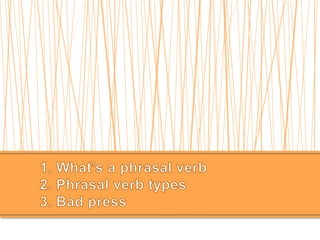 The document discusses phrasal verbs in English. It defines phrasal verbs as verb combinations consisting of a verb and particle. Phrasal verbs form new semantic units and the particle cannot be changed. Examples are given of transitive separable and non-separable phrasal verbs as well as intransitive phrasal verbs. The document also discusses two-particle phrasal verbs and provides examples and exercises for learners to practice identifying and using phrasal verbs.