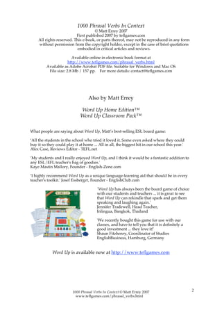 This document summarizes a book titled "1000 Phrasal Verbs In Context" that is designed to help English language learners improve their knowledge and understanding of phrasal verbs. Each phrasal verb is presented on its own page with two example sentences, common usage patterns, references to related phrasal verbs, and space for writing personal examples or notes. The book presents over 1,000 phrasal verbs in alphabetical order followed by quiz questions to test understanding. The goal is for learners to understand meaning from context rather than definitions alone.