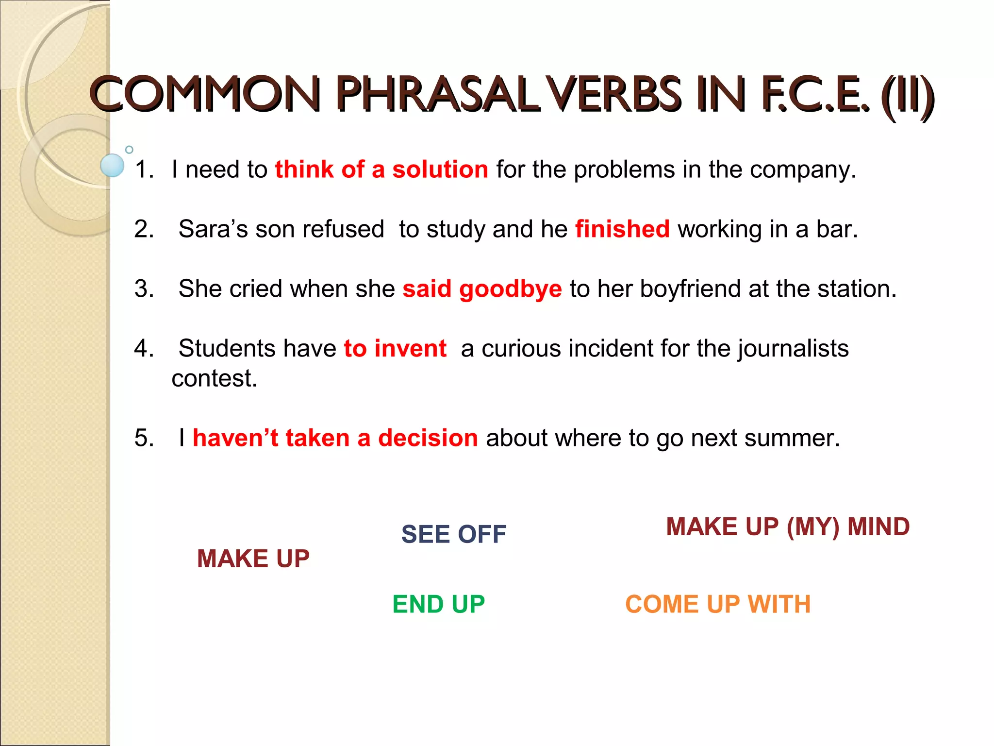 The document provides examples of common phrasal verbs used in the First Certificate in English (FCE) exam. It lists the phrasal verbs "end up", "see off", "come up with", "make up", and "make up my mind" with short sentence examples. It then provides another list of phrasal verbs with example sentences using "came up with", "ended up asking", "see her mother off", "making up stories", and "make up my mind". A final list gives the phrasal verbs "get on well with", "put me up in", and "make up my mind".