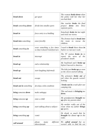 This document provides a list of over 200 common phrasal verbs in English. It explains that phrasal verbs consist of a verb and either an adverb or preposition, and have specific meanings like regular verbs. The list defines the meaning and provides an example sentence for each phrasal verb. It notes that some phrasal verbs have multiple meanings or specific grammatical rules regarding their use. The purpose is to serve as a reference guide for learners to understand the meanings and proper usage of common phrasal verbs in English.