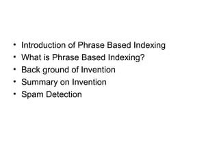 The document describes phrase-based indexing for information retrieval systems. It discusses identifying phrases in documents, indexing documents according to related phrases, ranking documents based on contained phrases and anchor phrases, and using phrases to generate descriptions of documents. The system can also detect duplicate and spam documents using the phrase information.