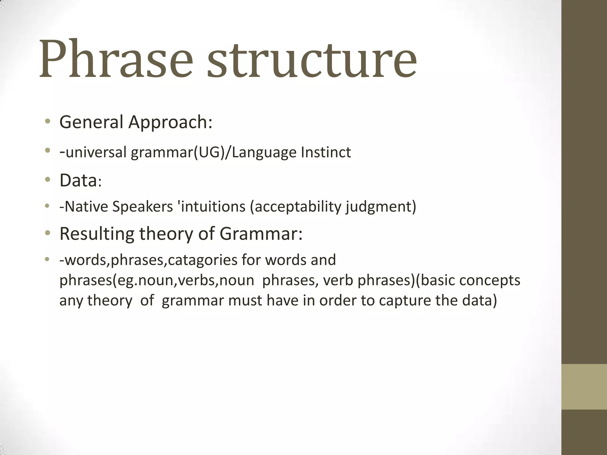 This document provides an overview of phrase structure rules in linguistics. It discusses that phrase structure rules determine how phrases are formed by governing what constituents can go into a phrase and their ordering. Examples of phrase structure rules are given for noun phrases (NP), prepositional phrases (PP), and verb phrases (VP). The document also includes example phrase structure trees illustrating how words and phrases are structured according to these rules.
