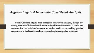 Phrase structure grammar was introduced by Noam Chomsky in the 1950s as an evolution of Immediate Constituent Analysis. Phrase structure grammars use rewrite rules to break down linguistic units like sentences into constituent parts such as noun phrases and verb phrases. The rewrite rules represent how morphemes are organized into words, words into phrases, and phrases into sentences. Phrase structure grammars have an advantage over older models as they incorporate labels into rewrite rules and allow rules to be applied sequentially to generate terminal strings.