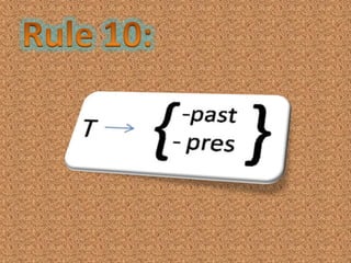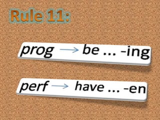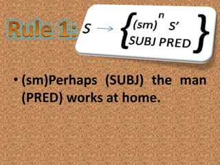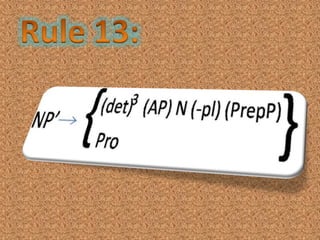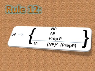 The document outlines rules for structuring sentences, including the core sentence components of subject, predicate, and optional modifiers. It describes the types of phrases that can fill subject positions such as noun phrases. The document also discusses the ordering of different types of adverbials that can appear in sentence-final position, including manner, direction, position, time, frequency, purpose, and reason adverbials.