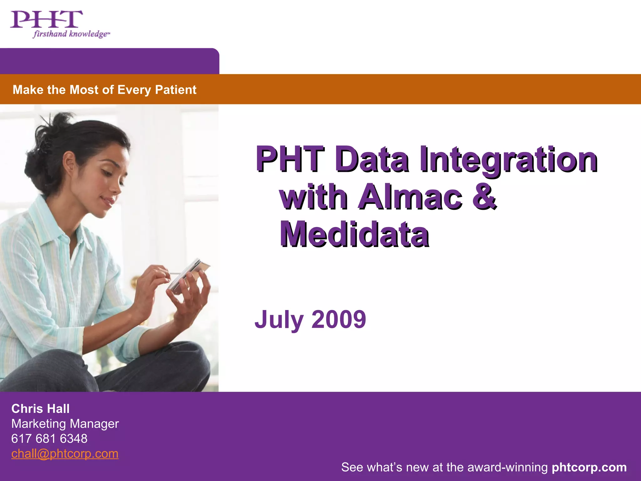 PHT, Almac, and Medidata have partnered to integrate their clinical trial systems in order to facilitate rapid data sharing. This integration allows sites and sponsors to view all real-time patient data within one system, eliminating duplicate data entry and reducing errors. It increases the ease of use of eClinical systems and reduces data management workload and costs for sponsors.