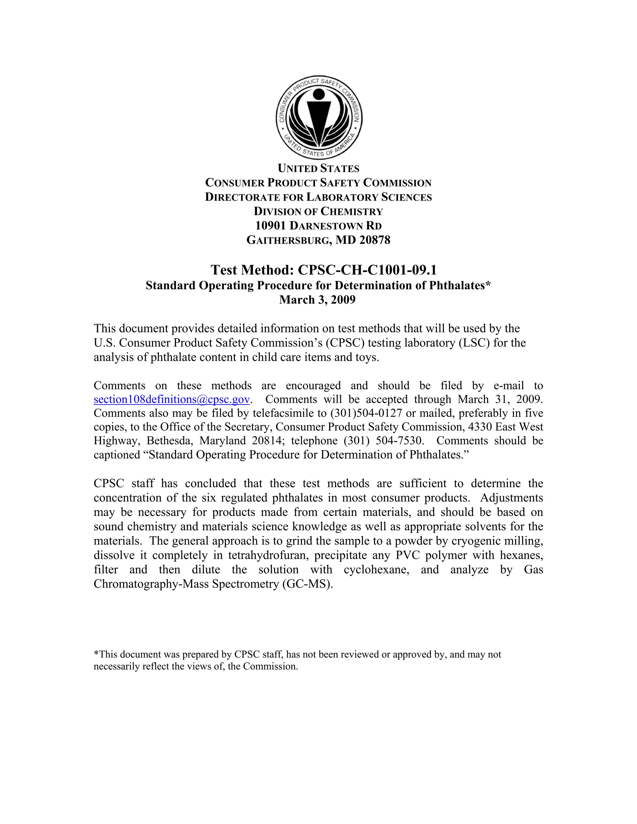 This document provides test methods for analyzing phthalate content in children's products used by the U.S. Consumer Product Safety Commission (CPSC). It describes sample preparation, phthalate extraction, gas chromatography-mass spectrometry operating procedures, quality control measures, and calculations for determining phthalate concentration. Comments on the methods are encouraged by March 31, 2009. The general approach is to grind samples, dissolve in solvents, filter, dilute, and analyze by GC-MS, integrating peak areas to quantify six regulated phthalates.