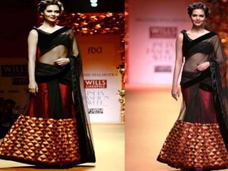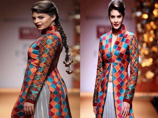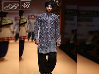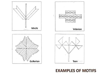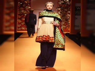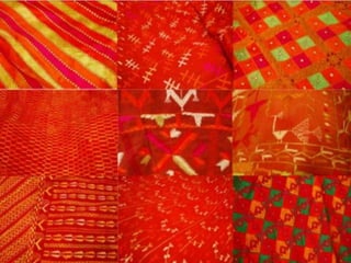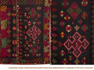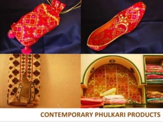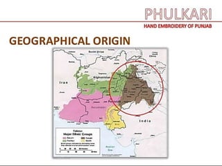 This document provides an overview of Phulkari, a traditional embroidery art from Punjab, India. It originated as a domestic craft used to decorate items like shawls and was inspired by motifs from daily life like vegetables and flowers. Various types of Phulkari include Bagh, Thirma, and Darshan Dwar Bagh which differ in their designs and patterns. Over time, the tradition has evolved with some associations trying to keep it alive though it has also been industrialized and commercialized. Famous designers like Manish Malhotra and Kanika Goyal have featured Phulkari in their work.