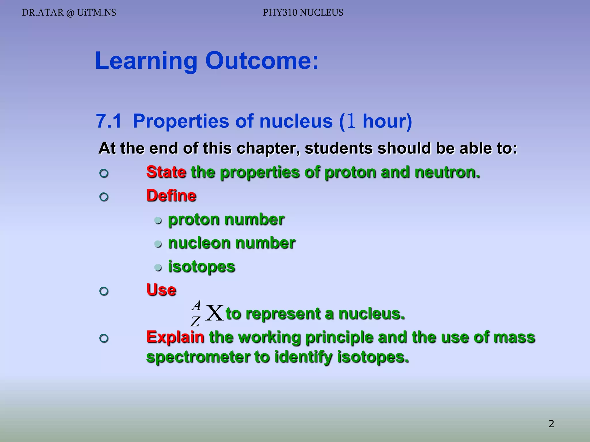 The document discusses properties of the nucleus, including: