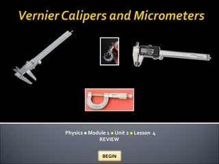 This document discusses measuring length using vernier calipers and micrometers. It describes the main parts of each instrument and how to take accurate readings. Choosing the appropriate measuring tool depends on the size, location, and difficulty of measuring the length. The document includes examples of measuring the diameter of objects and depth to illustrate how to select the best instrument. It concludes with a short quiz to test the understanding of using vernier calipers and micrometers.