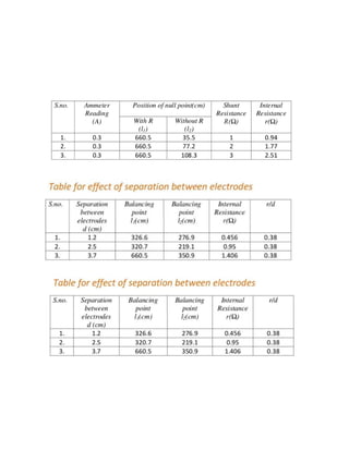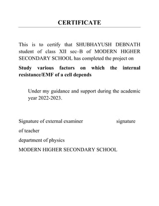 This project investigates the factors that affect the internal resistance of a cell. The student studies how internal resistance is impacted by the distance between electrodes, the surface area of electrodes in the electrolyte, the temperature of the electrolyte, and the concentration of the electrolyte. Experiments are conducted to determine the internal resistance of cells under different conditions for each of these factors. Observations are recorded and internal resistance values are calculated. The conclusion is that internal resistance increases with electrode separation and decreases with greater electrode area, higher electrolyte temperature, and higher electrolyte concentration.