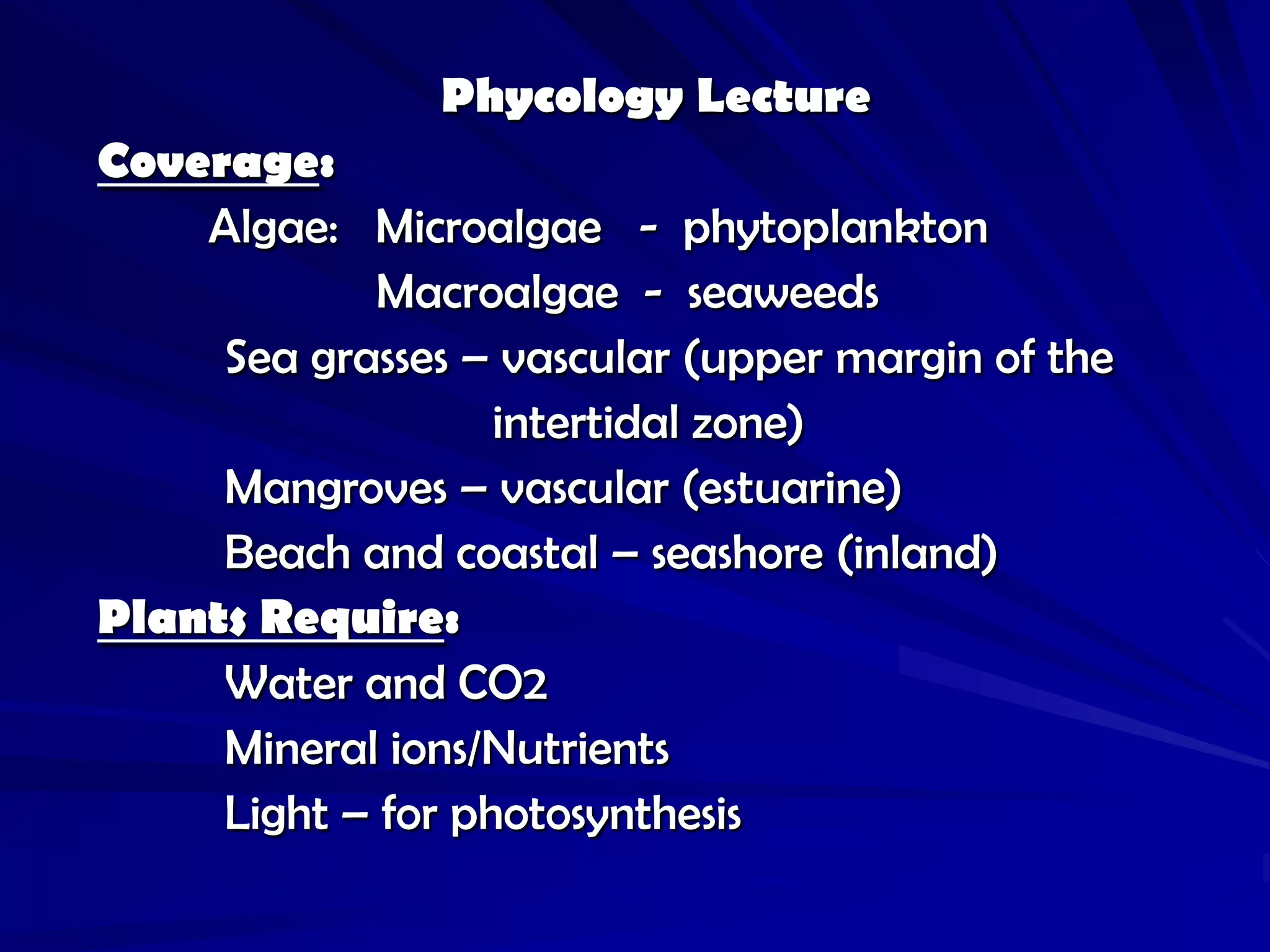 This document provides an overview of phycology (the study of algae). It discusses the key requirements for algal growth like water, CO2, nutrients, and light. It describes algal life cycles and the alternation of generations between sporophytic and gametophytic stages. The document also outlines the major divisions of algae and lists some characteristics like pigments, food reserves, and habitats. Factors that influence algal distribution like tides, waves, substrate, and depth of light penetration are summarized as well.