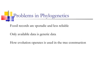 This document discusses phylogenetic studies and the construction of phylogenetic trees. It notes that fossil records are unreliable, so phylogenetic trees are primarily based on molecular sequencing data and morphological data. There are several assumptions made in phylogenetic analysis, including that sequences are homologous, phylogenetic divergence is bifurcating, and each position in a sequence evolved independently. The document outlines different types of phylogenetic trees, steps in phylogenetic analysis like choosing molecular markers and tree building methods, and criteria for assessing the reliability of phylogenetic trees.