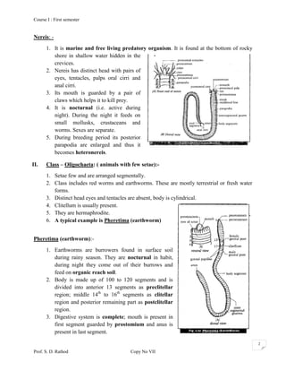 The document provides an overview of the phylum Annelida, detailing its characteristics, classification, and examples of organisms within the major classes: Polychaeta, Oligochaeta, and Hirudinea. It describes the morphological traits, habitats, and reproductive behaviors of notable examples such as Nereis (a marine predator) and Pheretima (the earthworm), as well as the characteristics of leeches in the Hirudinea class. Key features include segmentation, type of setae, and survival strategies for these organisms.