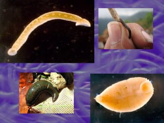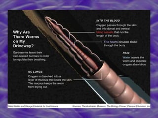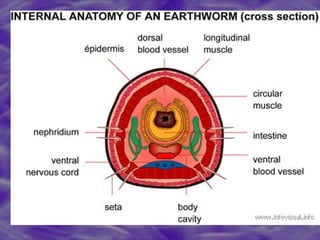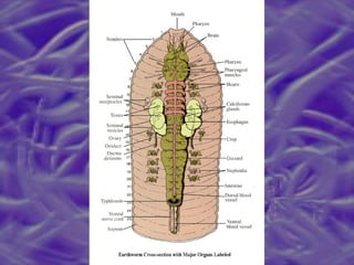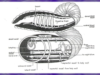 The document discusses the phylum Annelida, or segmented worms. It describes their characteristics, such as being hermaphroditic and having a true coelom. It then discusses different classes of annelids, including Polychaeta (marine fanworms and free-swimming worms), Oligochaeta (earthworms), and Hirudinea (leeches). For earthworms specifically, it outlines their movement, excretion, digestion, respiration, circulation, response, and reproduction systems.
