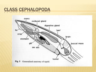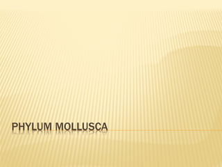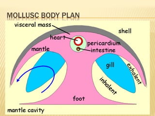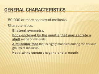 The document summarizes key characteristics of mollusks. It notes that there are over 50,000 mollusk species that are bilateral and have a mantle that may secrete a shell. They have a muscular foot and a head with sensory organs and a mouth. It discusses their respiratory and digestive systems and life cycles. The document focuses on three mollusk classes: Gastropoda which include snails and slugs, Bivalvia which include clams and mussels, and Cephalopoda which include squid and octopus. It provides examples and characteristics of each class.