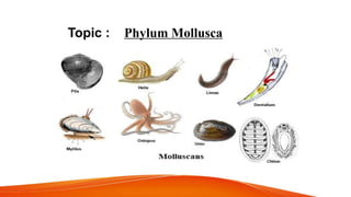Phylum Mollusca is the second largest invertebrate phylum, comprising approximately 85,000 extant species, with members characterized by a soft body, bilateral symmetry, and typically a calcareous shell. The phylum is divided into six major classes, including Gastropoda and Cephalopoda, each exhibiting distinct body structures and adaptations. Molluscs possess a variety of traits such as a well-developed digestive system, open circulatory system (except cephalopods), and diverse reproductive strategies.