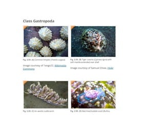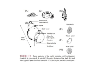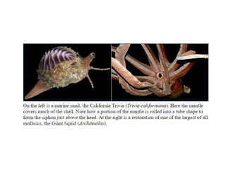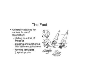 The phylum Mollusca is the second largest animal phylum. They are soft-bodied organisms that often have an external shell or plates. Their bodies generally have a head, muscular foot, and visceral hump or mass. They have a mantle that secretes the shell and covers the body. Molluscs live in nearly every habitat and have diverse feeding adaptations like the radula. Major classes include gastropods, bivalves, cephalopods, and polyplacophorans.