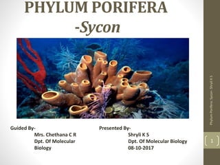 The document presents an overview of the phylum Porifera, specifically focusing on the genus Sycon, which are marine calcareous sponges. It covers their classification, habitat, structure, nutrition, and reproduction methods, highlighting features such as their skeletal spicules and both asexual and sexual reproduction processes. The document also includes references and acknowledgments for guidance received during the seminar preparation.