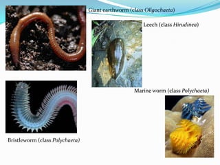 This document provides information about segmented worms of the phylum Annelida. It discusses three main classes of annelids: Oligochaeta (earthworms), Hirudinea (leeches), and Polychaeta (marine worms). It describes the habitats and behaviors of different annelid classes, including how earthworms live underground, leeches live near freshwater, and marine worms live in the ocean. The document also covers anatomical features of annelids like their segmented bodies and adaptations that allow them to live on land or in varied environments.