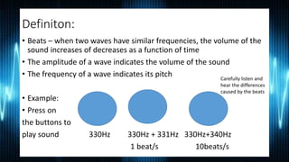 Beats occur when two sounds with similar frequencies are played together, causing the overall volume to increase and decrease over time. The frequency of a wave determines its pitch, while the amplitude determines volume. When two tones have a small frequency difference, such as 330Hz and 331Hz, beats will occur approximately once per second. But with a larger difference, like 200Hz vs 400Hz, beats are no longer present. Beats can be modeled mathematically using equations that describe the interaction of two wave amplitudes over time and position. Questions about beat frequency and number of beats in a time period can be solved using formulas involving the individual frequencies.